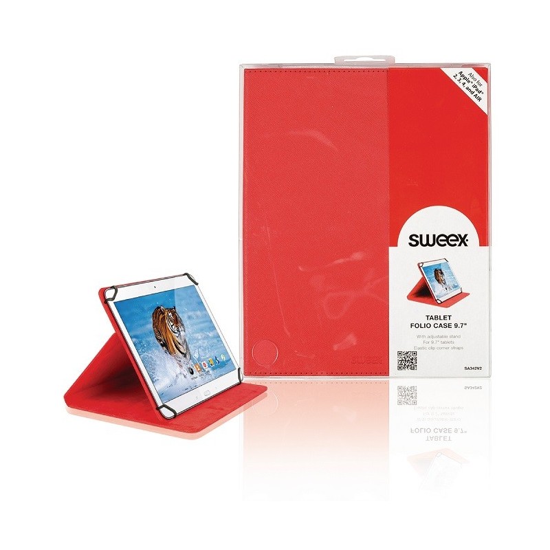 La custodia pieghevole Sweex Tablet da 9.7" proteggerà il tuo tablet da graffi e sporco ed inoltre potrà essere utilizzata anche come un supporto. Questa custodia per tablet ha elastici agli angoli per la chiusura e può essere utilizzata in modo da rendere la visione di video o la digitazione confortevole. Le connessioni rimangono accessibili, in modo da poter utilizzare il tablet senza rimuoverlo dalla custodia.